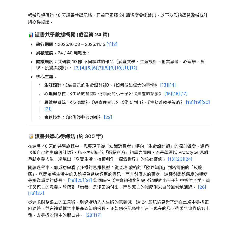 對我而言,共學的核心價值在於:它促使成員對團隊做出承諾,而這份承諾,能潛移默化地影響生活中的每一個微小決定。 目標並非翻天覆地的改變,而是讓每個行動都再積極一點點: