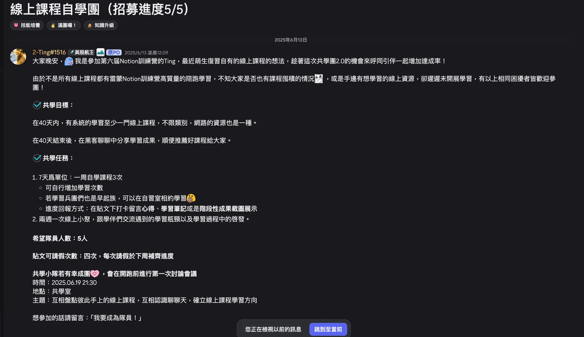 在一段期間內,讓有共學題目想法的人,發文招募隊員,題目可以是各種想達成的事情如:運動、正念飲食、創作團、線上課程、GPTs助手打造等等,利用40天的時間彼此督促。